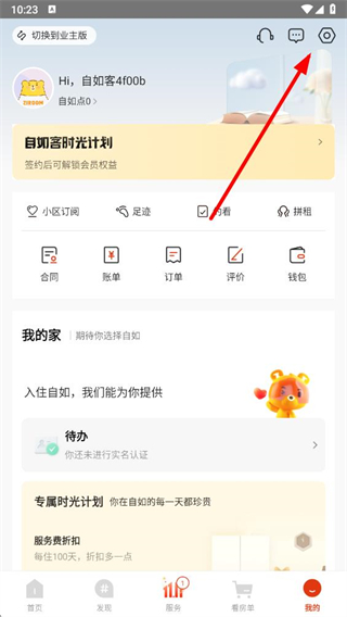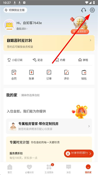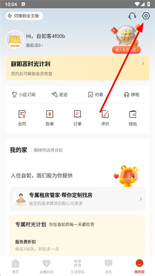 1、打开自如app,在我的家界面,点击右上角的设置图标,进入设置页面。
