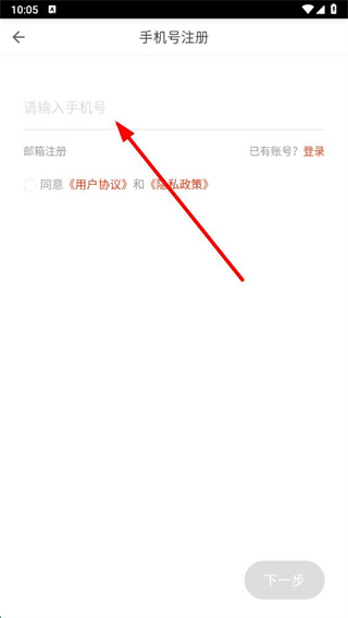 3、在手机号注册页面输入手机号,勾选同意相关协议后点击下一步。