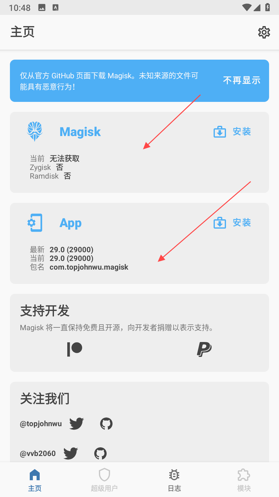 1、进入主页,可看到Magisk和App的安装选项,根据提示,仅从官方GitHub页面下载Magisk,点击对应安装按钮进行操作,同时还能看到支持开发和关注开发者的相关板块。