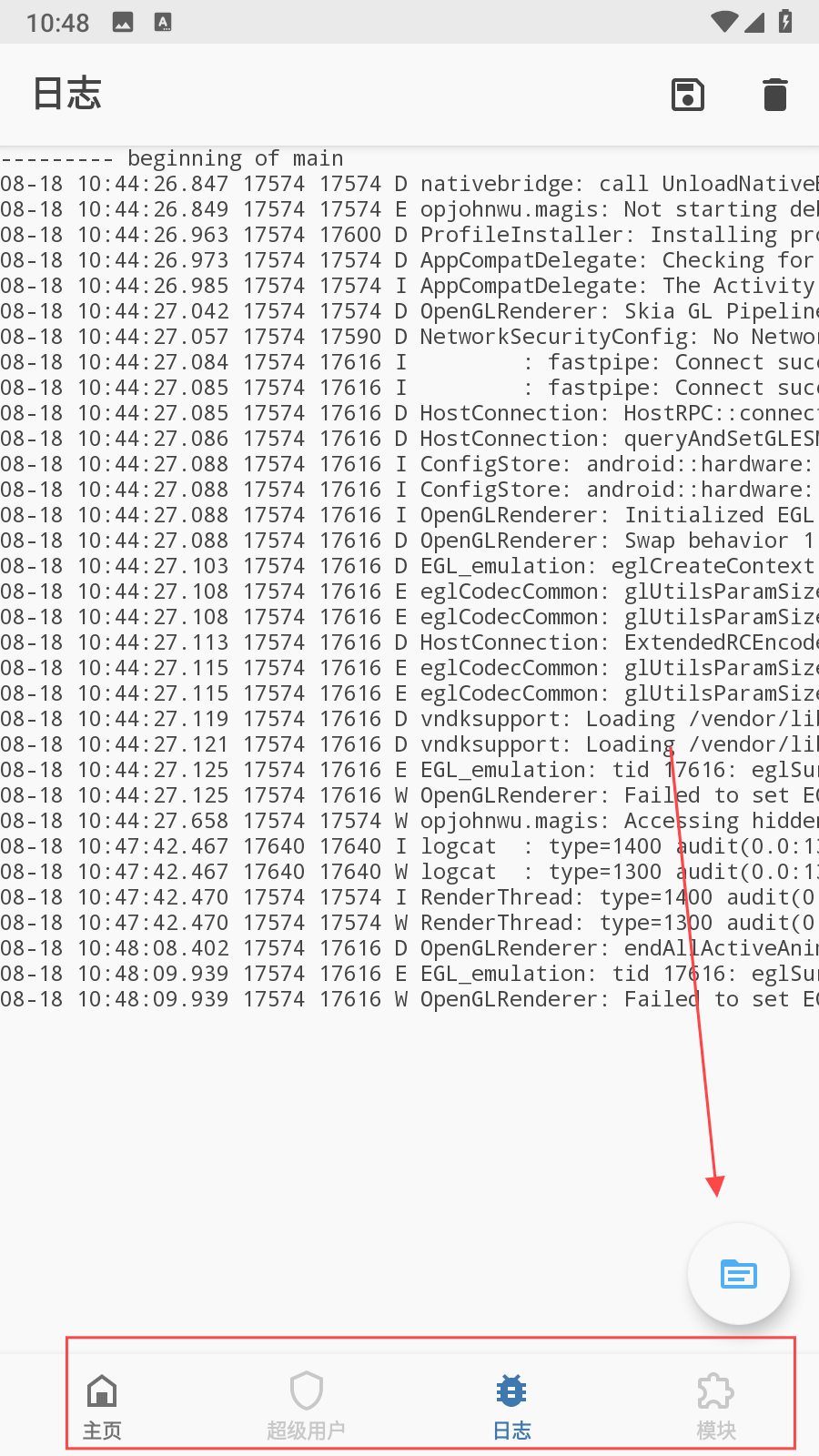 2、切换到日志页面,可查看详细的日志内容,了解软件运行等相关信息,页面底部有主页,超级用户,日志,模块等选项,可在不同页面间切换。