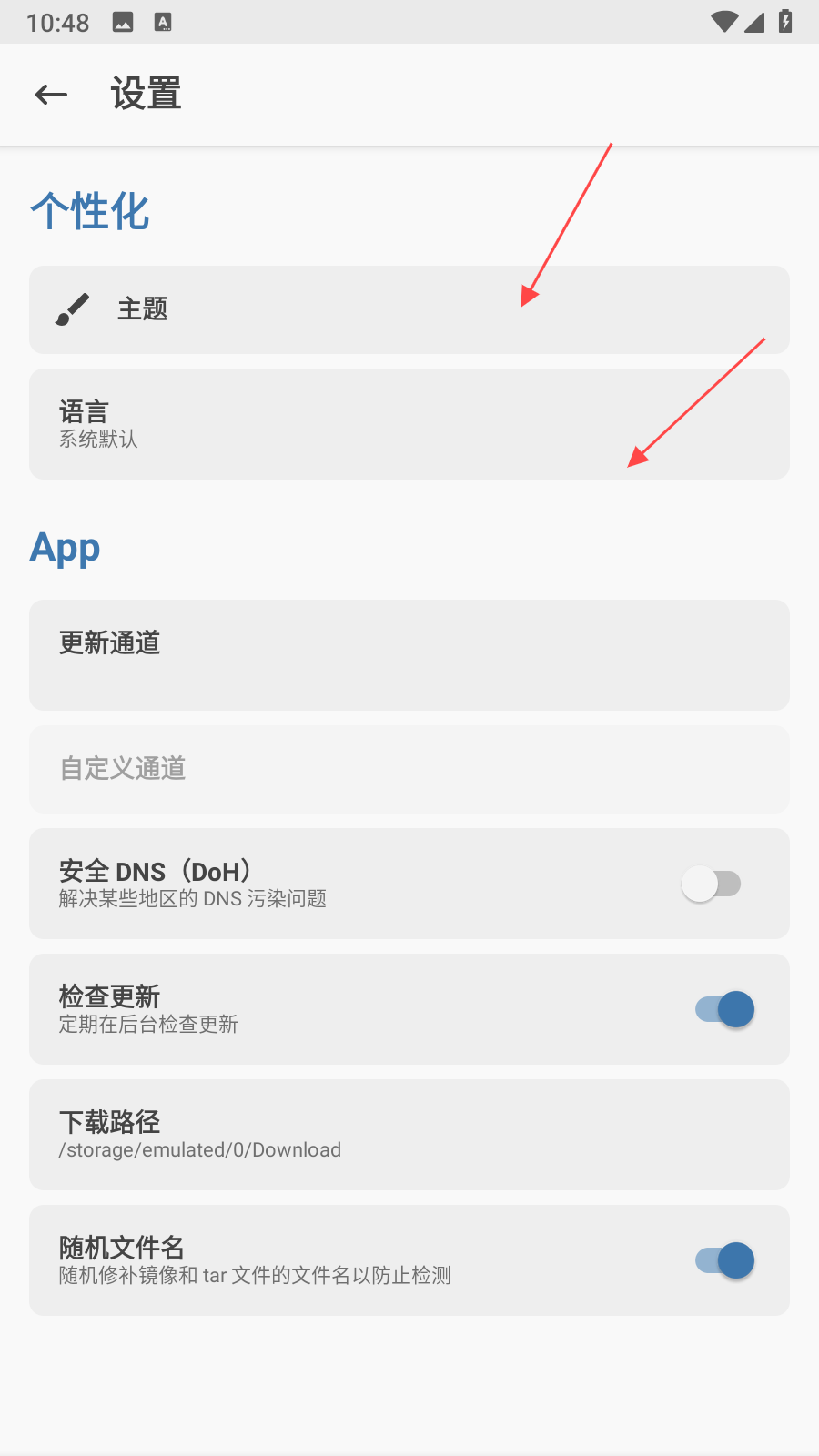 3、进入设置页面,在个性化板块,可设置主题和语言,在App板块,能选择更新通道,设置安全DNS(DoH),检查更新,下载路径,随机文件名等,根据需求进行各项设置。