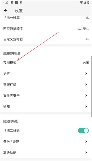 3、在设置页面中找到扫描分辨率选项,点击该选项进入分辨率选择界面。