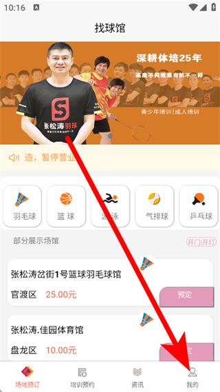 1、打开找球馆,点击底部的我的,进入我的页面。