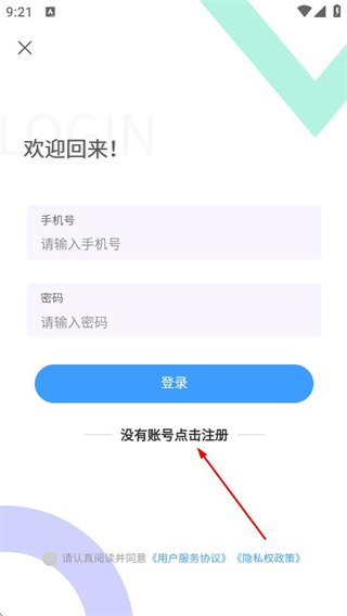 3、在登录页面,点击没有账号点击注册选项,进入注册账号页面。
