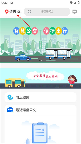 2、在公交e出行首页,点击顶部的请选择的按钮,进入城市选择页面。