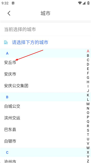 3、在城市选择页面,选择所需的城市,完成公交e出行的城市选择操作。