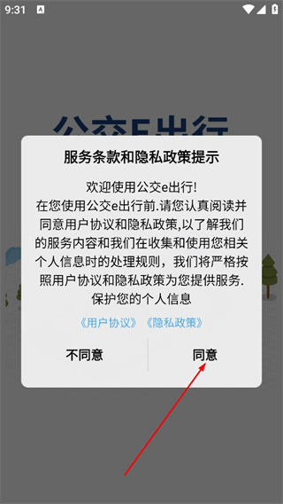1、在服务条款和隐私政策提示弹窗中,点击同意,进入公交e出行首页。