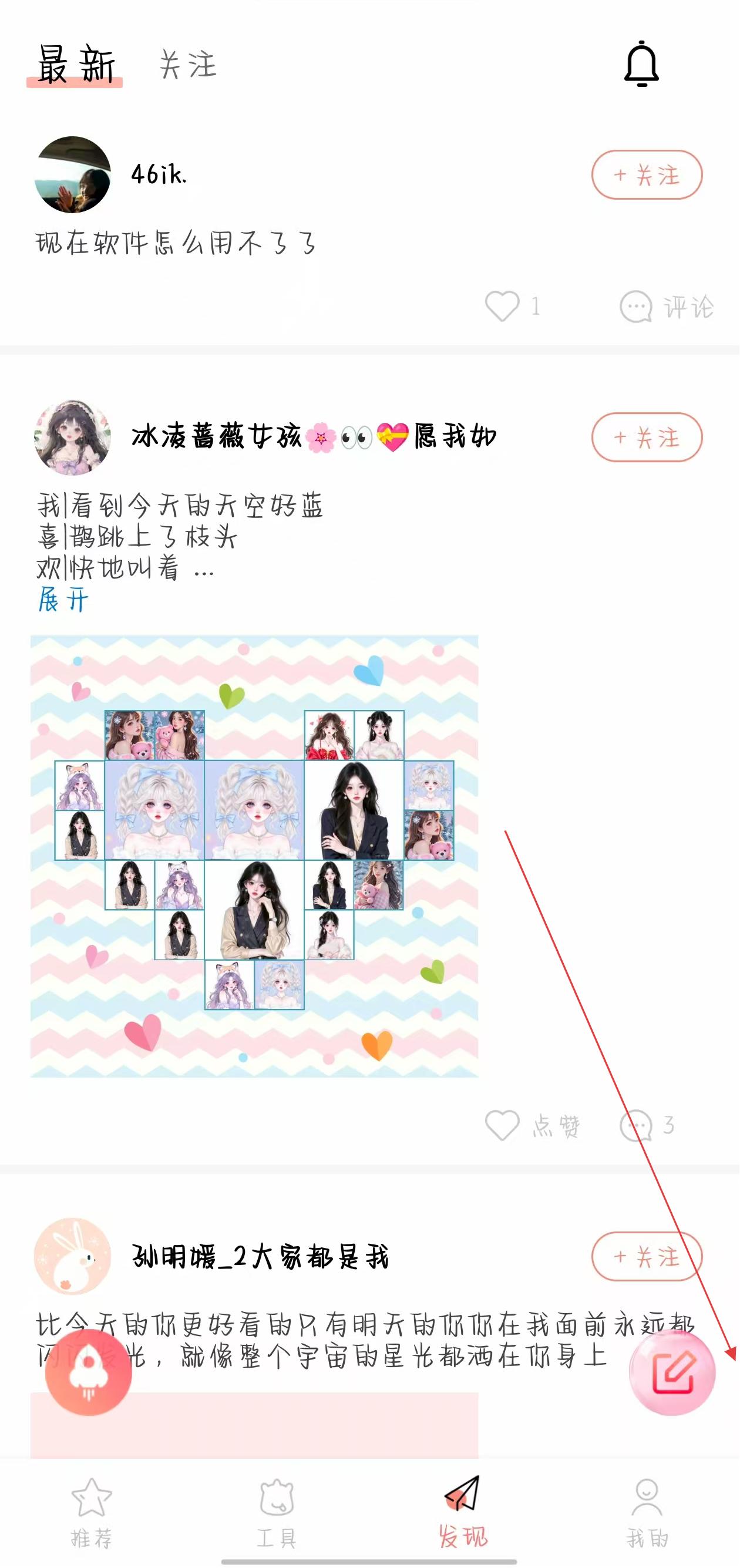 2、在发现页面,点击右下角的发布按钮,进入动态编辑页面。