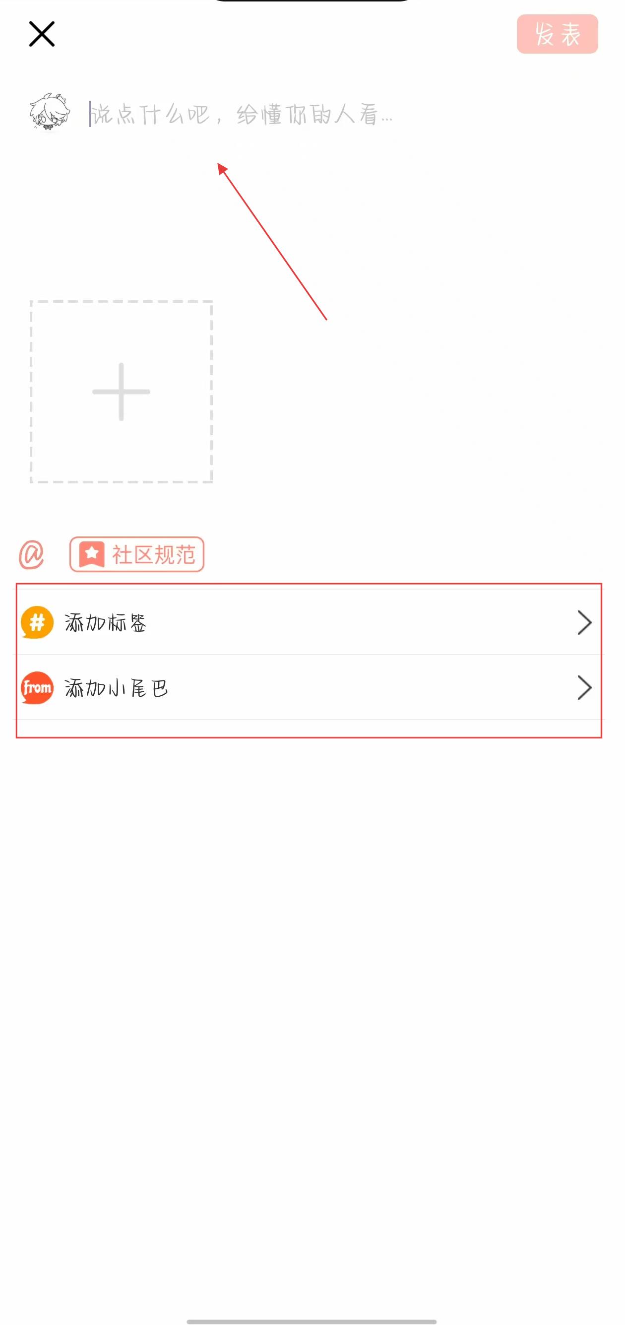 3、在动态编辑页面的输入框中,输入要发布的内容,也可点击添加标签,添加小尾巴进行个性化设置。
