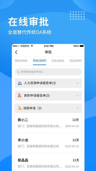 4、在线审批,全面替代传统oa系统,为用户带来办公便捷。