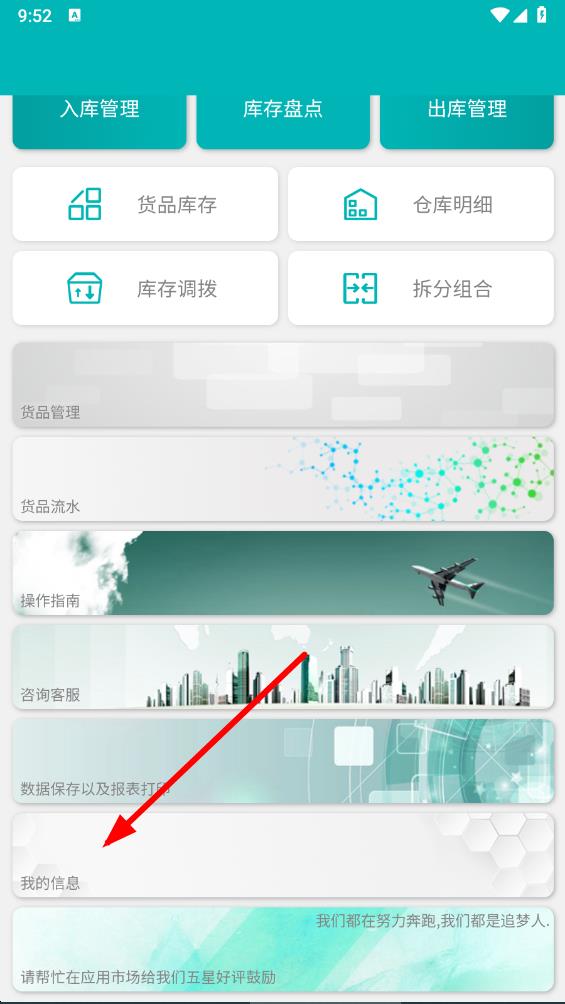1、打开库存管理通软件,在主界面中找到并点击我的信息选项,进入个人信息查看与设置页面。