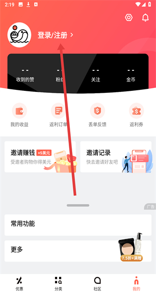 2、在个人中心页面点击“登录/注册”,进入登录/注册页面。