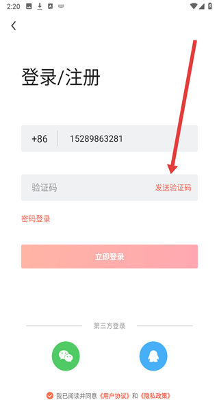 3、在登录/注册页面输入手机号,点击“发送验证码”。