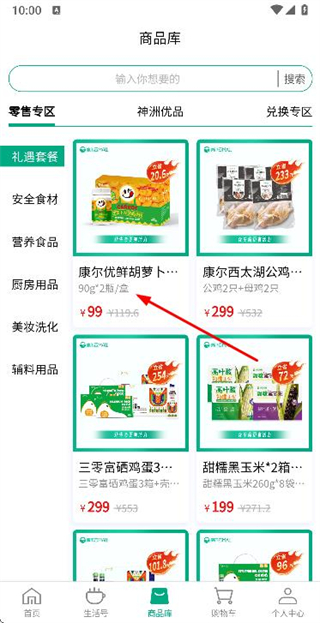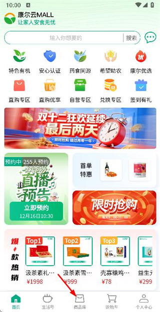 1、在康尔云MALL首页点击底部的商品库选项,进入商品库页面。