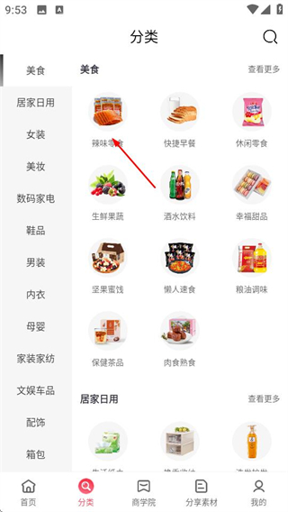 2、在分类页面,点击辣味零食选项,进入辣味零食的商品列表页。