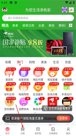 1、在喜客宝首页,点击底部的分类选项,进入分类页面。