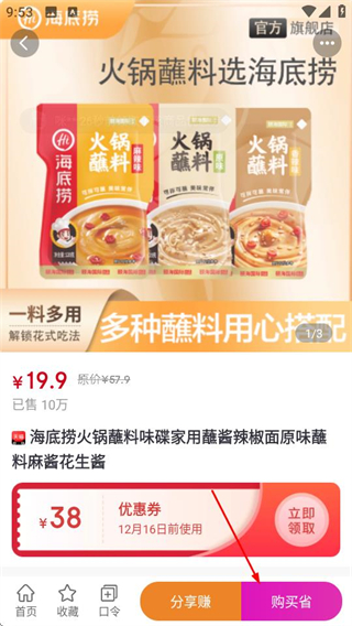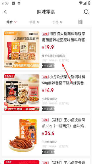 3、在列表页,点击目标商品如海底捞火锅蘸料,进入商品详情页。