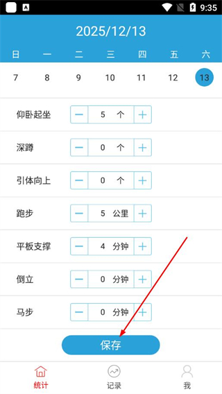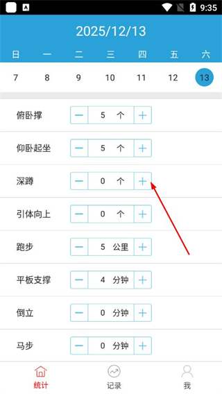 1、打开健身统计app的统计页面,选择目标日期,通过+/-按钮调整各项运动的完成量。