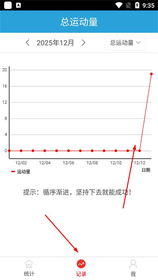 3、切换到记录页面,可查看月度总运动量的趋势图表,追踪运动数据变化。