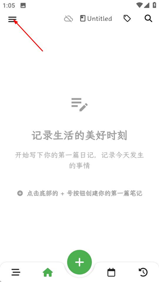 1、在人生笔记Real首页,点击左上角的菜单按钮,展开功能列表。