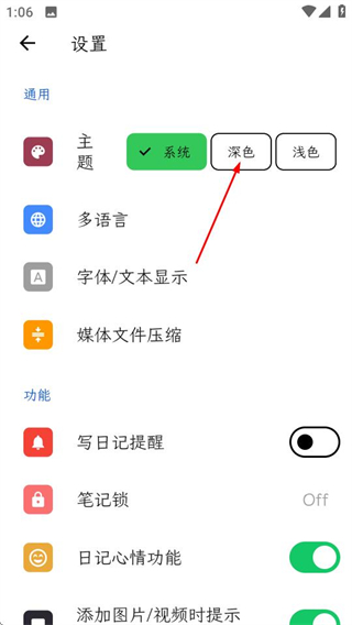 3、在设置页面,选择主题分类下的深色选项,即可切换为深色模式。