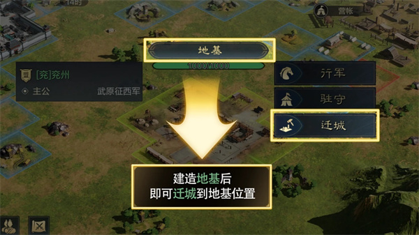 1、在攻打城池完成迁城之后,可以建立一个城池,把自己的势力全部迁移到这个城池,获得官员或者城主统一之后就可以建造基地;