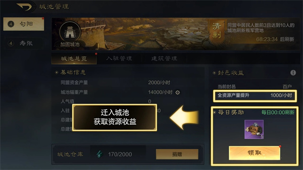 2、让自己领地的百姓成为该城池的居民之后,会增加我们资源产出的速度,更是可以领取每日的俸禄;