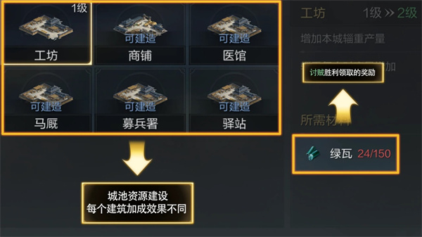 4、城主或者是管理者通过讨贼就可以获得绿瓦,使用资源就可以建造城池,会有多个建筑可以建造;