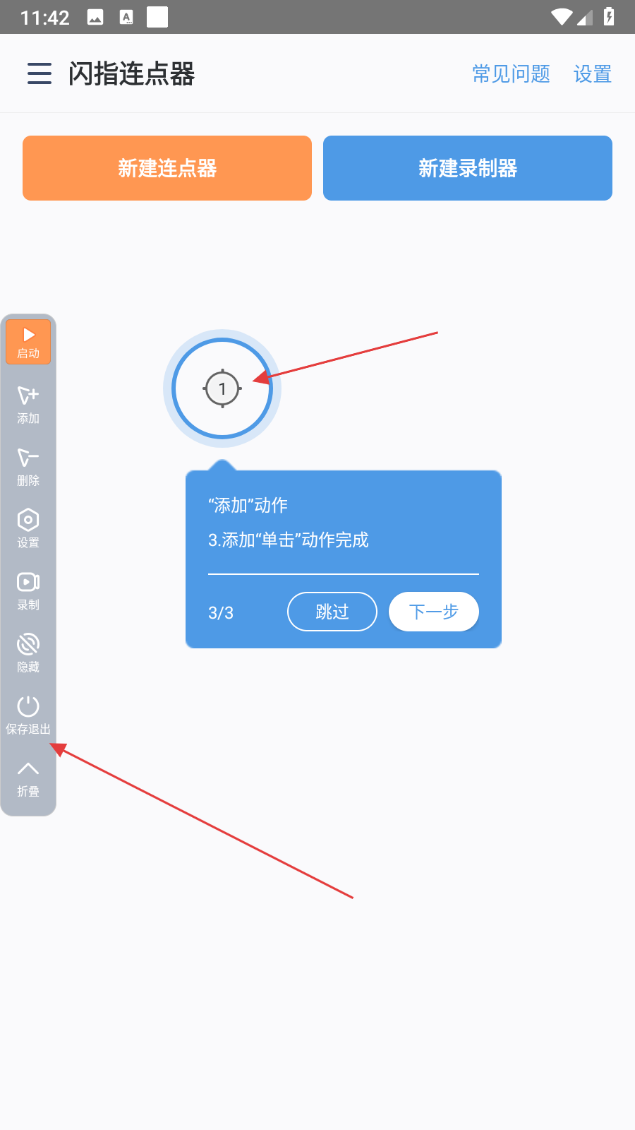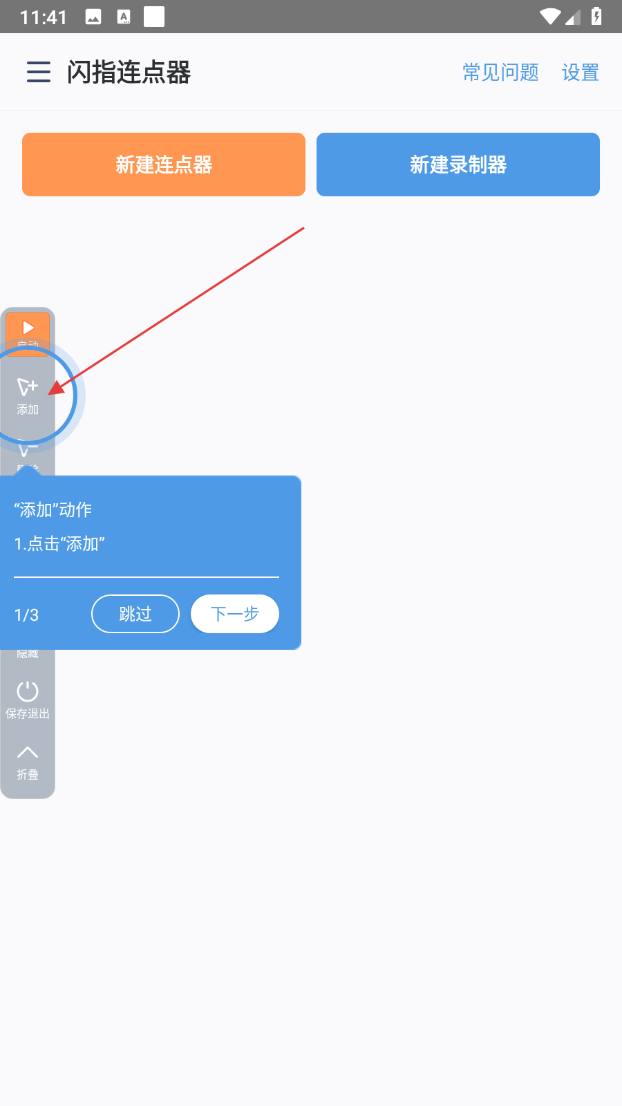 1、打开闪指连点器应用进入主界面,点击左侧栏中的添加按钮,开始添加自动化点击动作。