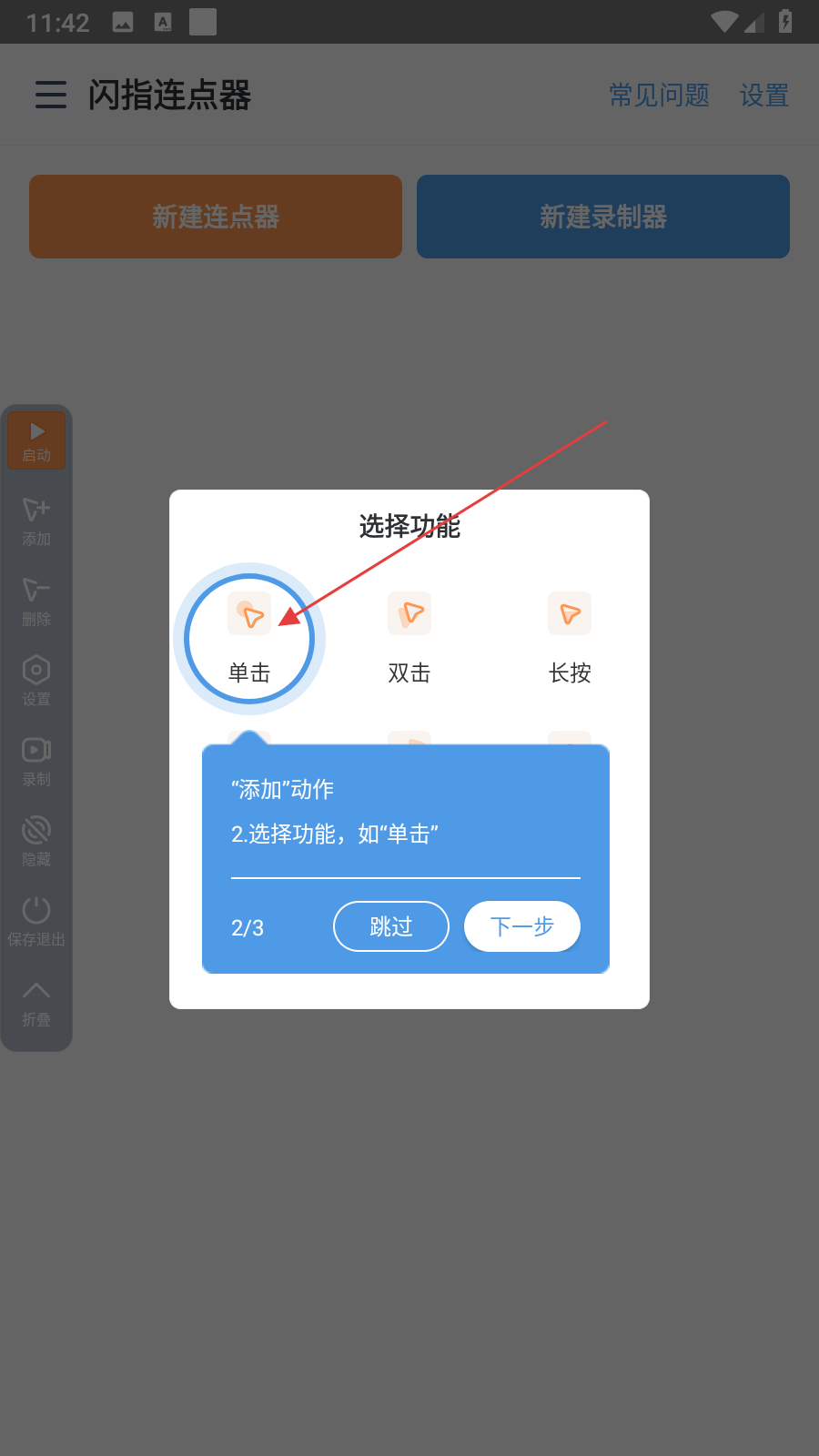 2、点击添加后弹出选择功能界面,选择需要的点击功能比如单击双击,长按,这里以单击为例,选中单击后点击下一步。