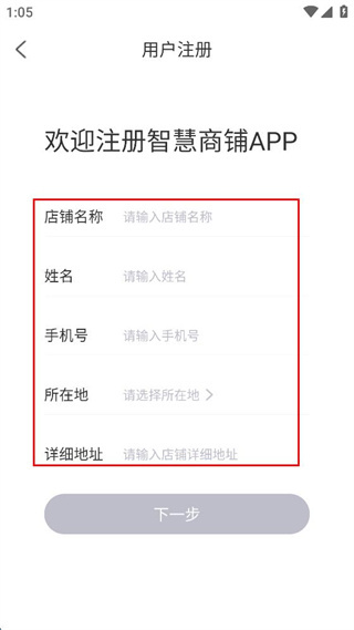 2、在用户注册页面输入店铺名称、姓名、手机号、选择所在地并输入详细地址。