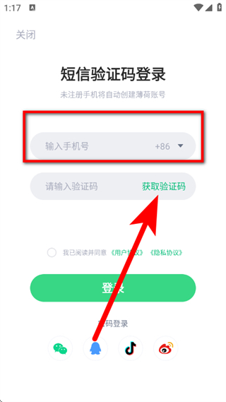 3、在登录页面,输入手机号,点击获取验证码。