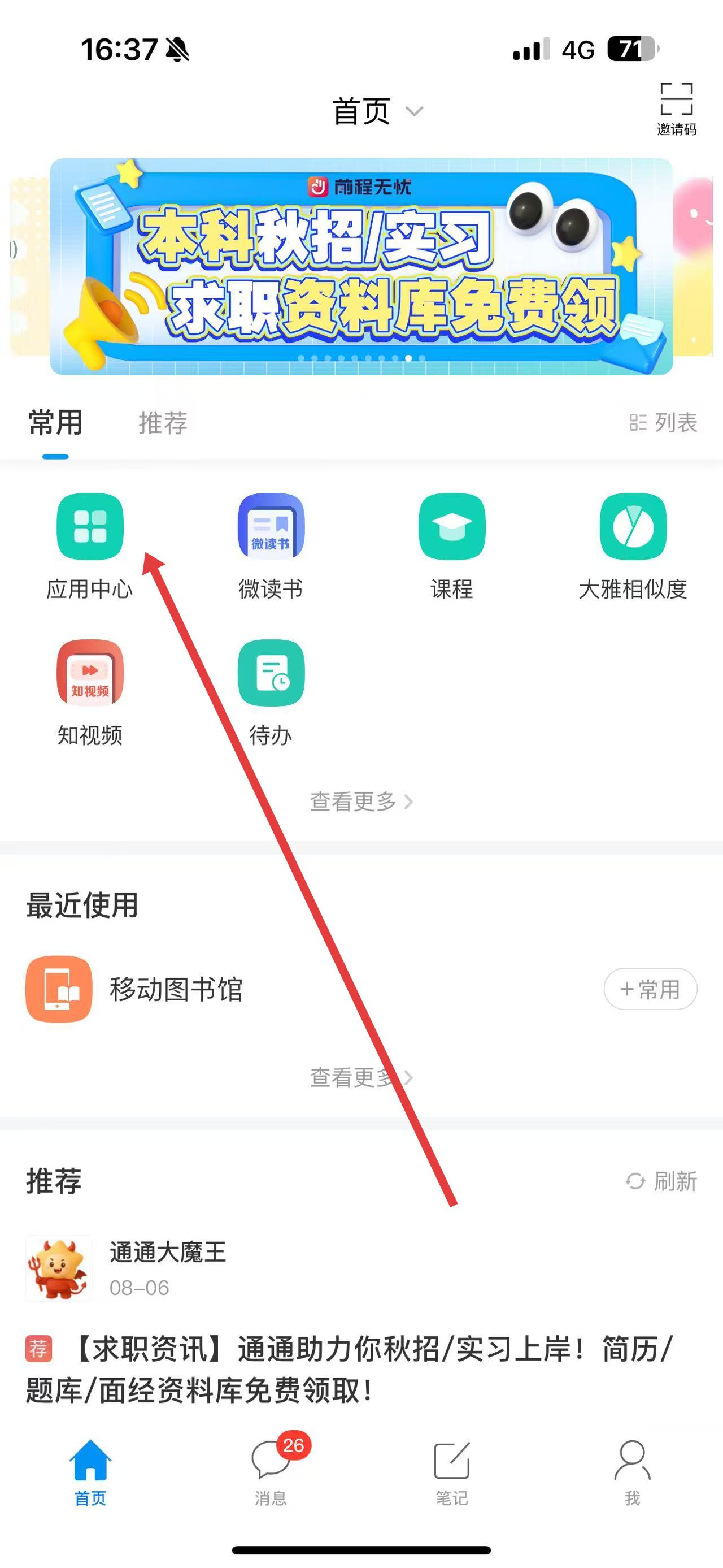 1、打开超星学习通App,在首页界面点击应用中心选项。