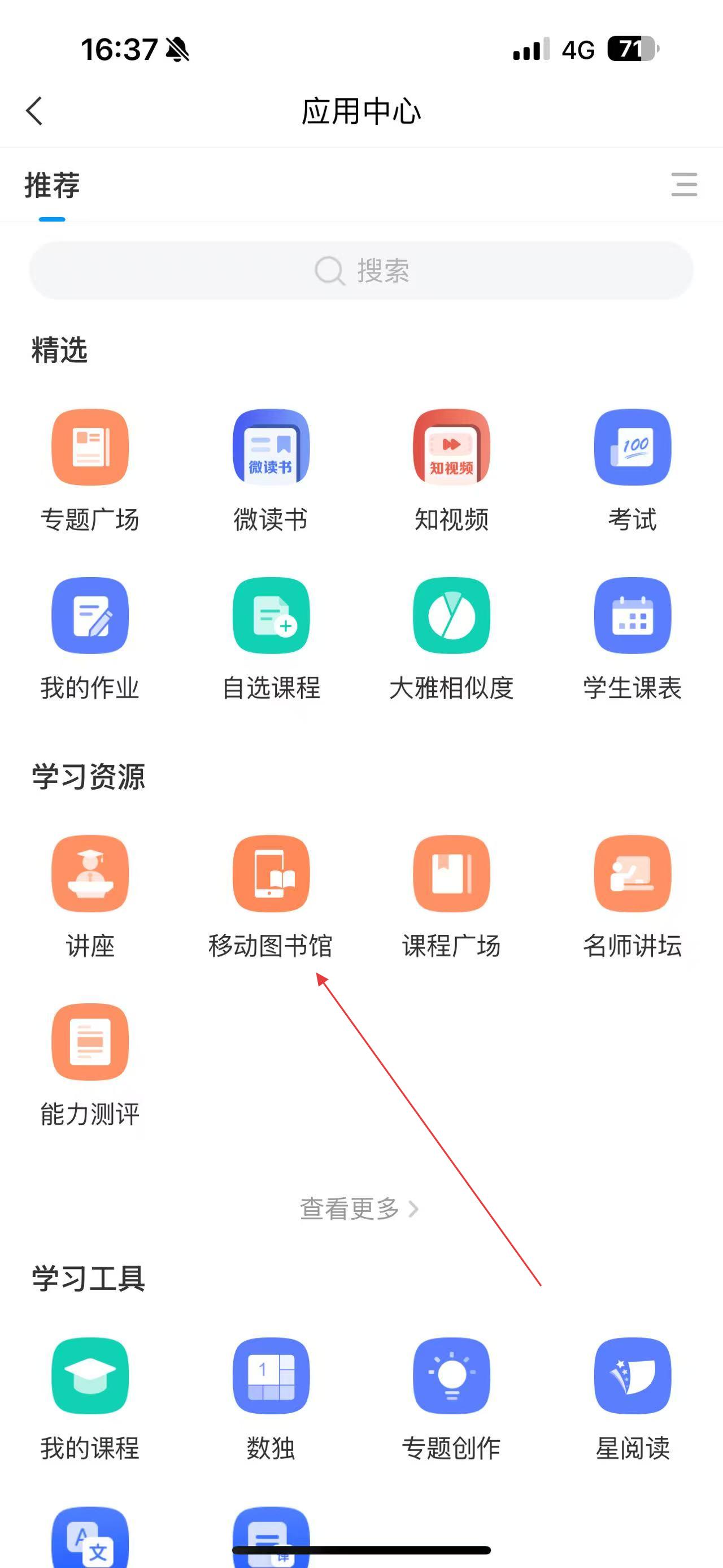 2、进入应用中心页面后,在学习资分类下点击移动图书馆。