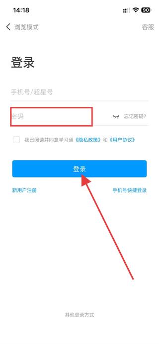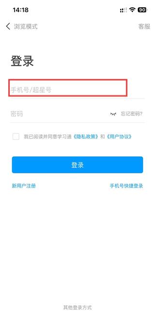 3、在登录界面的手机号/超星号栏,填写对应的账号信息。