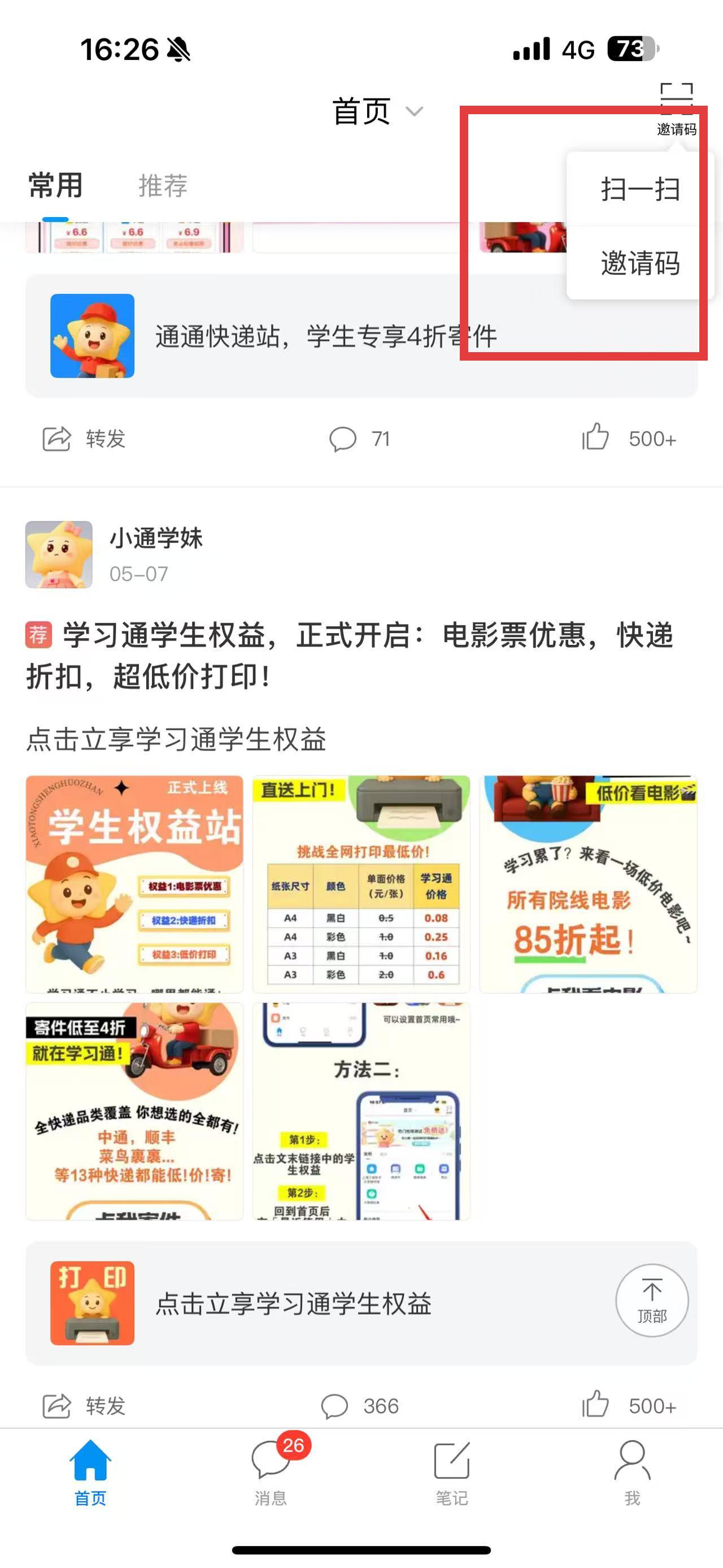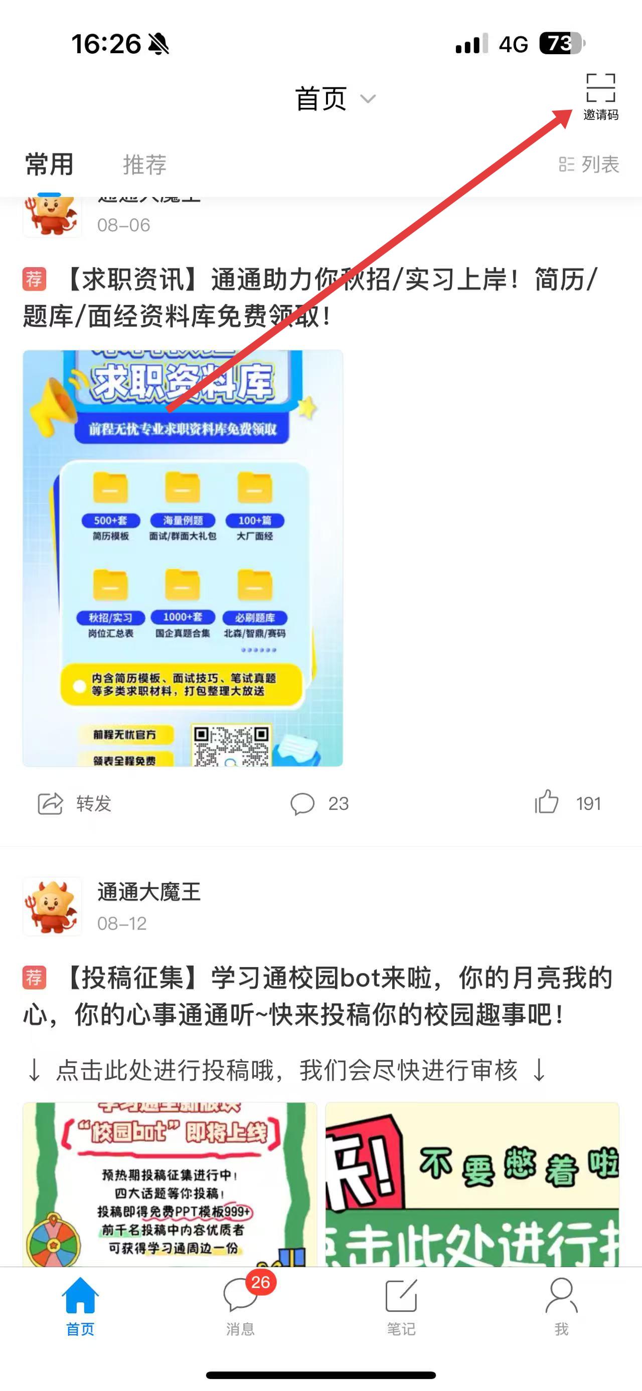 1、打开超星学习通App,在首页界面点击右上角邀请码按钮。