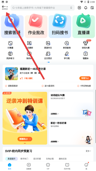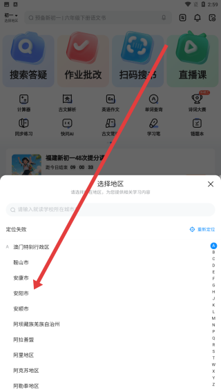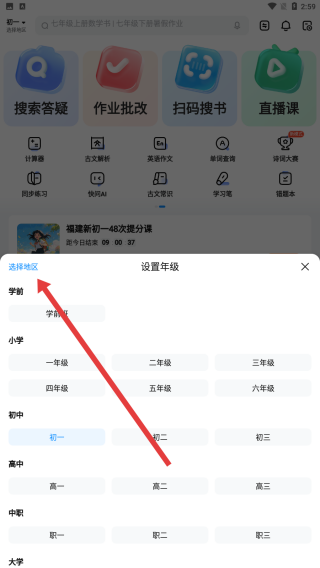 1、在进入到作业帮的首页中后,可以点击箭头指向左上角区域,进行地区的选择。