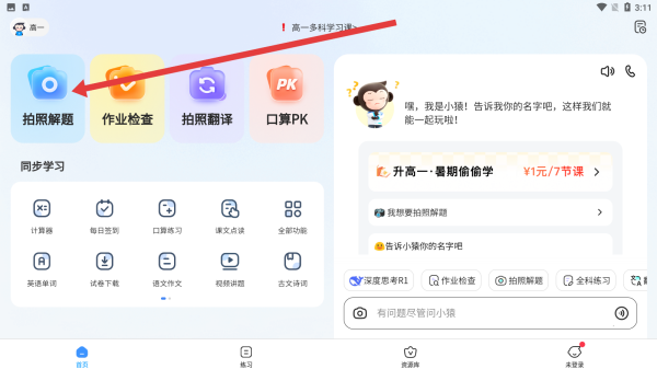 1、在APP首页点击拍照解题图标,进入相机权限申请环节,开启借助该功能解决学习难题的流程,迈出拍照解题第一步。