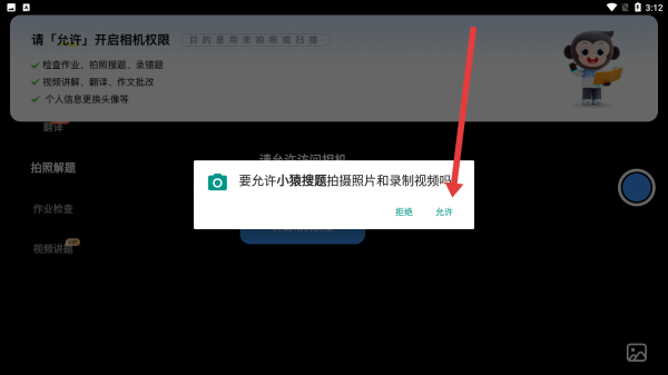 2、当弹出相机权限申请弹窗时,点击允许,授予小猿搜题拍摄及录视频权限,为拍照解题功能启用完成权限准备。