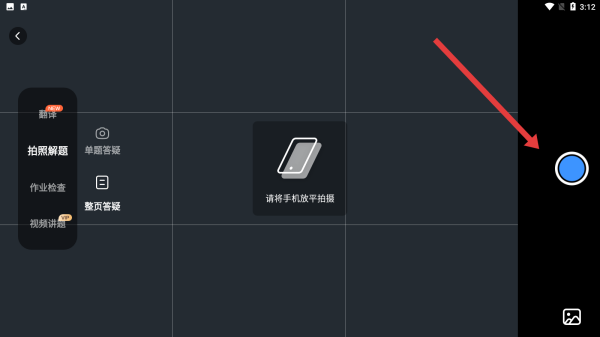 3、进入拍照解题界面,将手机放平对准题目,点击右侧蓝色拍摄按钮启动拍摄,借助功能获取题目解答思路或答案。