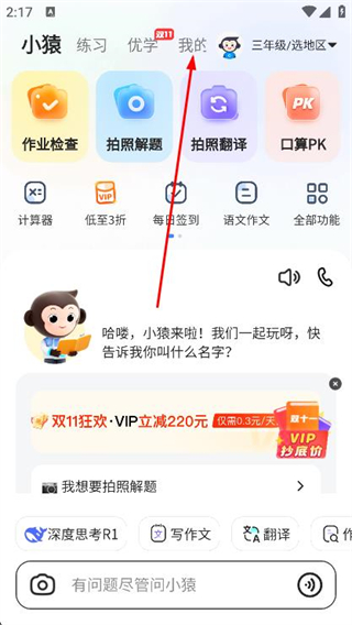 1、打开小猿搜题app,点击顶部导航栏我的选项。