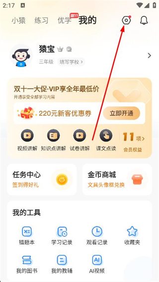 2、在练习页面右上角,点击个人设置区域的年级选择入口,进入设置年级界面,准备调整学习年级。