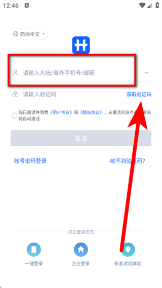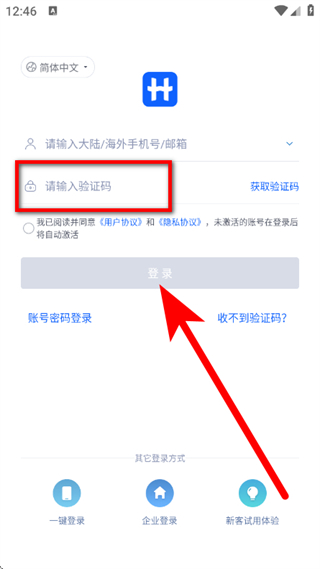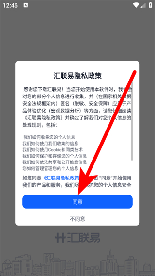 1、打开汇联易,在弹出提示框,点击同意,进入登录界面。