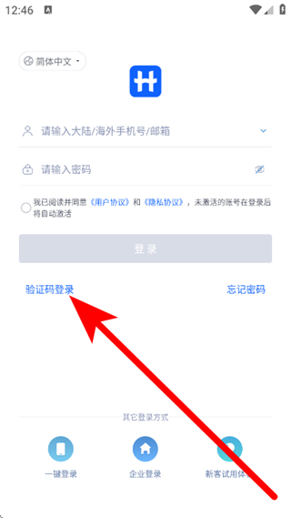 2、在登录界面,点击验证码登录,切换至验证码登录页面。