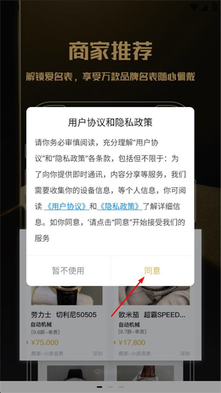 1、打开爱名表软件,查看用户协议和隐私政策弹窗,点击界面中的“同意”按钮。