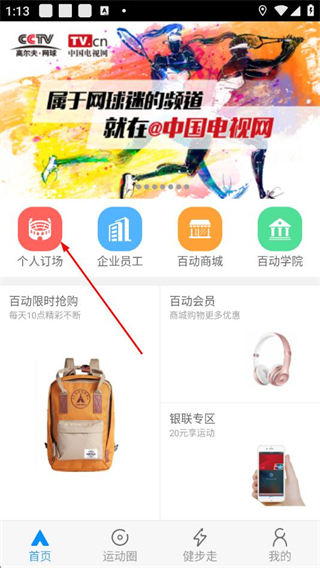 1、打开百动运动管家的首页,点击个人订场选项,进入订场服务界面。