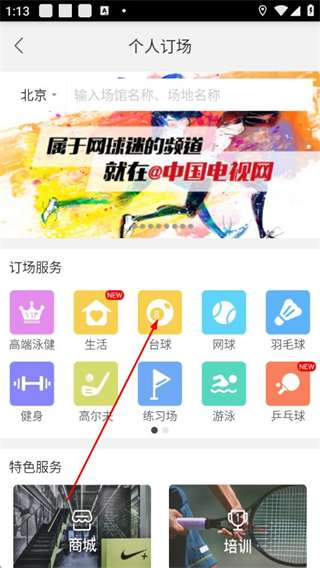 2、在个人订场页面的订场服务板块,选择目标运动类型,进入对应场地列表。