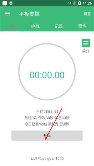 1、打开平板支撑app的训练页面,确认当前训练计划后,点击开始启动训练计时。