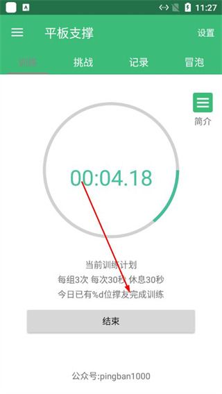 2、按照计时完成平板支撑动作,训练结束后点击结束,完成本次训练流程。