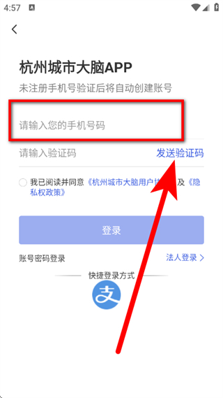 3、在登录页面,输入您的手机号码,点击发送验证码。